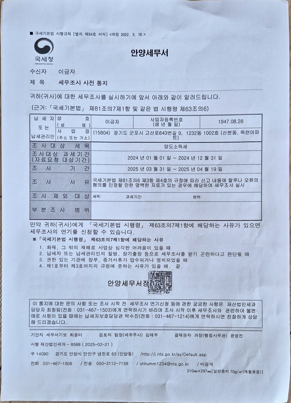 세무서에 물어보니 오피스텔이 문제가 되어 이번에 세무조사 대상이 되었다고 합니다.